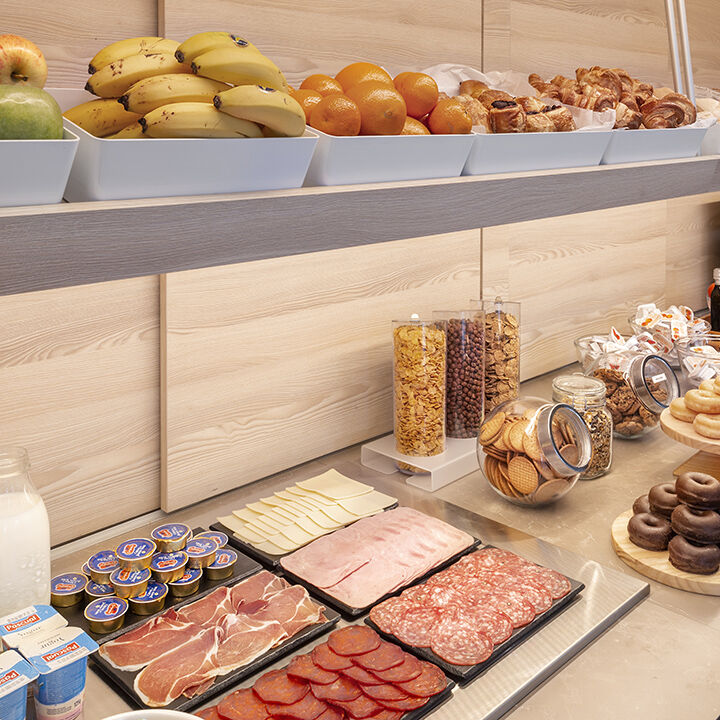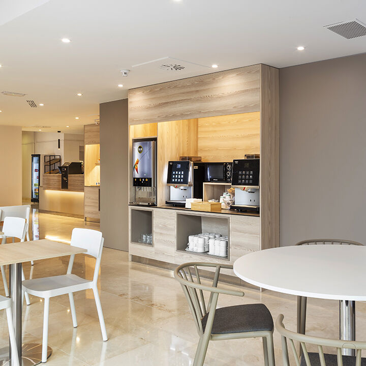 Fui a cargar mi coche electrico y mientras tanto entre para ver si podía tomar algo, eta la hora del desayuno. Como no era clienta del hotel compré el desayuno bufet que tienen por 11€ y resultó ser una porquería, tenían café, zumos, poca bollería, tres tipos de pan, creo que unos cereales y un poco de queso en lonchas, otro poco de jamón de York, unas rodajas de chorizo Revilla y unas rodajas de salchichón, creo que también había tomate rallado. Muy pocas cosas tanto de variedad como de cantidad y poca calidad. Una cosa buena es que el personal es súper amable. Del resto del hotel no puedo opinar ya que no estaba alojada pero en general tenía buena pinta y había bastante gente pero el desayuno deja mucho que desear