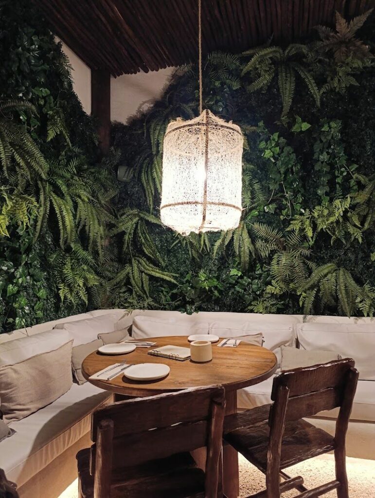 Estuvimos en la planta inferior del local y es muy agradable. La planta de la calle me pareció un poco sobrecargada con las plantas. Nos gustó mucho la comida. El camarero fue educado y amable pero con poca experiencia y hubo una confusión con el número de la mesa , lo que ocasionó que el servicio fuera muy lento.
