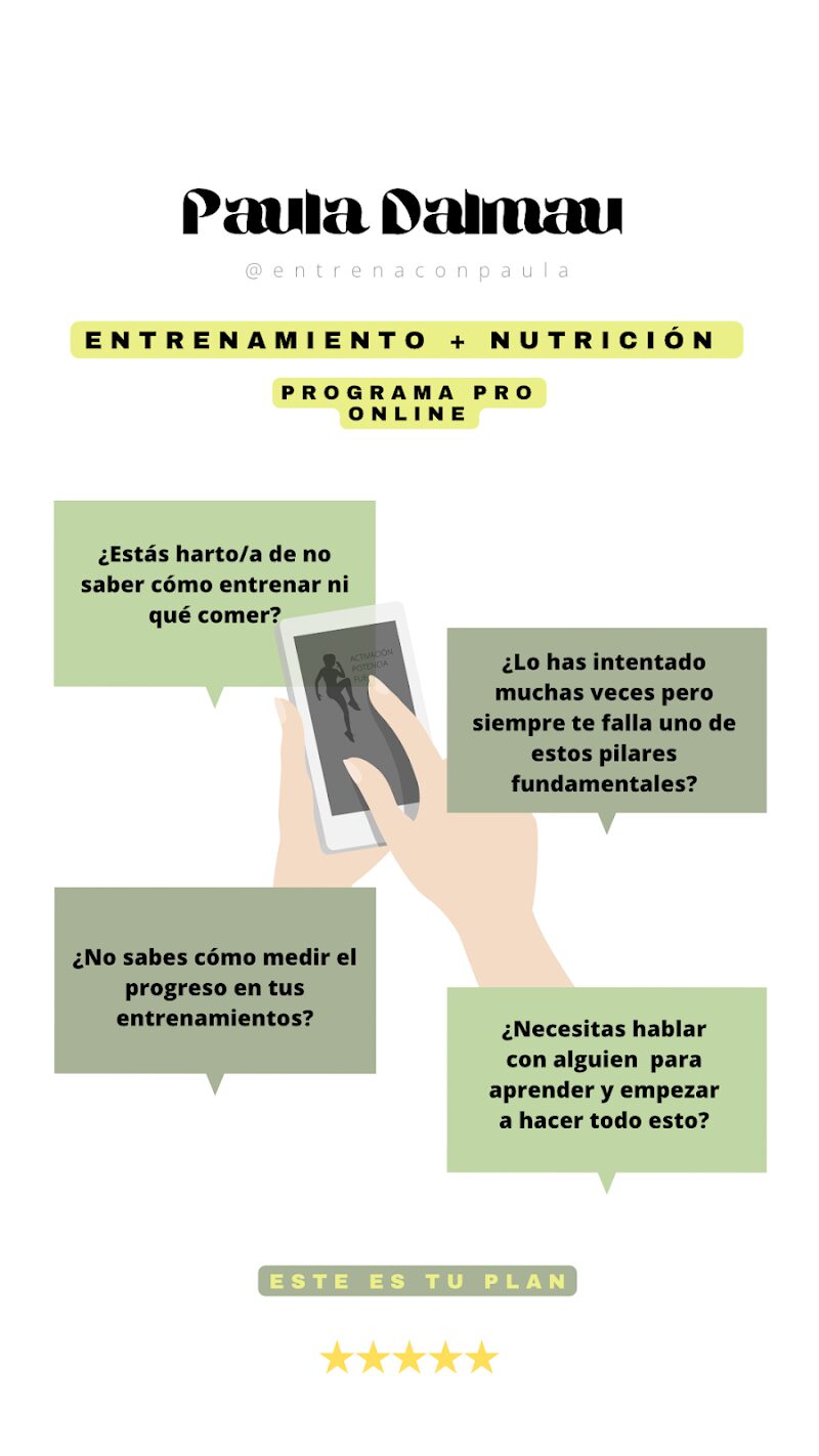 ¡Entrenadora y motivadora 10! Llevo 8 meses entrenando con ella!! Y no veo el día que deje de entrenar con ella. Ha sabido ajustar los entrenes a mi estilo de vida, y me ha sabido motivar para cambiar algunos hábitos diarios. de manera que he podido completar mi objetivo: perder grasa, disfrutar del proceso y hacer que el entrene forme parte de mi vida!! Mil gracias Paula por tu energía y por todo!! Es un placer seguir contigo. Nunca pierdas tu esencia ♥️