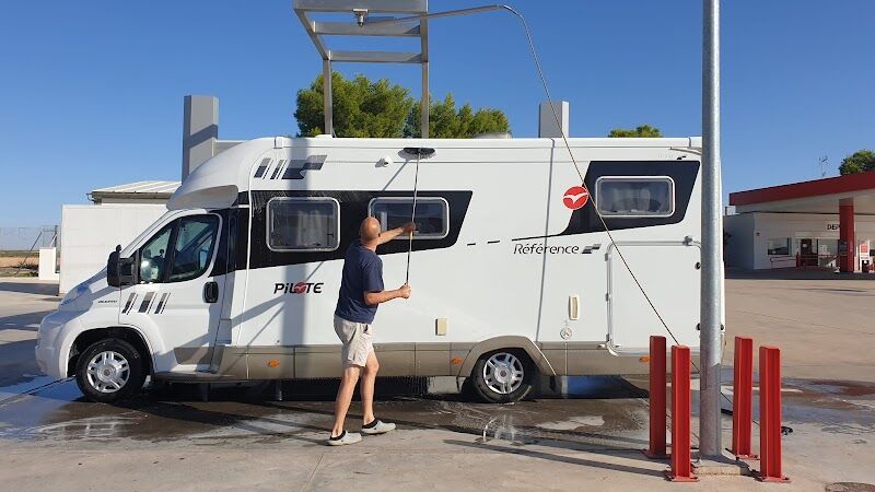 Tienen una zona para lavar a los perros bastante buena. Cuando tenga que lavarle, repetiré aquí. Sale el agua calentita, tiene opción de desparasitación y el aire, aunque lo mismo sale un poco fuerte (ya sabemos cómo son estos con los soplidos fuertes) está muy bien para secar. Tienen mandiles para no mojarte. La zona de lavar coche ya es más escueta. Solo con lanza. El cepillo es aparte y no está conectado al agua ni jabón.