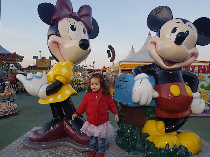 Sencillo parque con atracciones, juegos de feria, personajes disfrazados y puestos.
