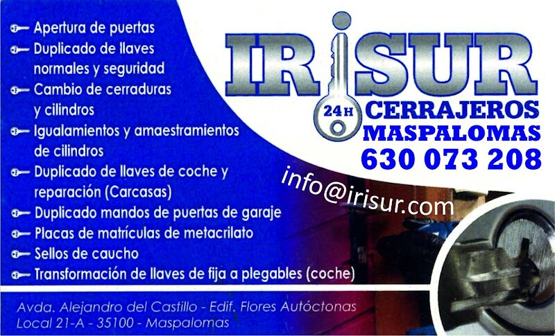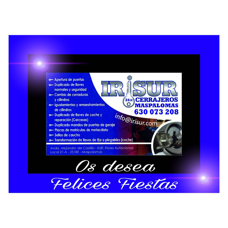 Excelente trato, servicial y rápido. Perdí las llaves de mi apartamento a una hora ya tarde donde todos los establecimientos estaban ya cerrados y pensé que tenia que dormir en un hotel. Llamé a Irisur desesperado y, aún estando fuera de horario laboral, el chico joven llegó de muy buen humor y encantado de poder ayudarme. Un héroe sin capa. En menos de dos minutos abrió la puerta y posteriormente me cambió la cerradura. Debo decir que el trato recibido es exquisito y el precio es ajustado acorde al impecable servicio ofrecido. Volveré a llamar a Irisur y lo recomiendo sin lugar a dudas.