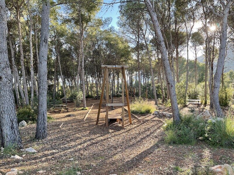 El lugar esta bien si estas por la zona y buscas un lugar para parar a comer,aunque al parecer habían celebrado un cumpleaños y habían dejado toda la basura allí a pesar que hay contenedores en la entrada y tampoco parecía que limpiaran mucho la zona.Esta junto a una zona residencial,no en un bosque,aunque hay muchos pinos y mucha sombra,mesas de piedra con bancos de piedra,hay barbacoas aunque estaban cerradas por el peligro de incendio en esta epoca y también hay baños aunque ponía horario de 10a 20 y estaban cerrados.hay un pequeño parque con un tobogán y descubrimos que había otra zona con bancos y mesas detrás de los pinos,donde hay un tirolina y otros juegos de madera y cuerda,antes de irnos pudimos ver las ardillas.