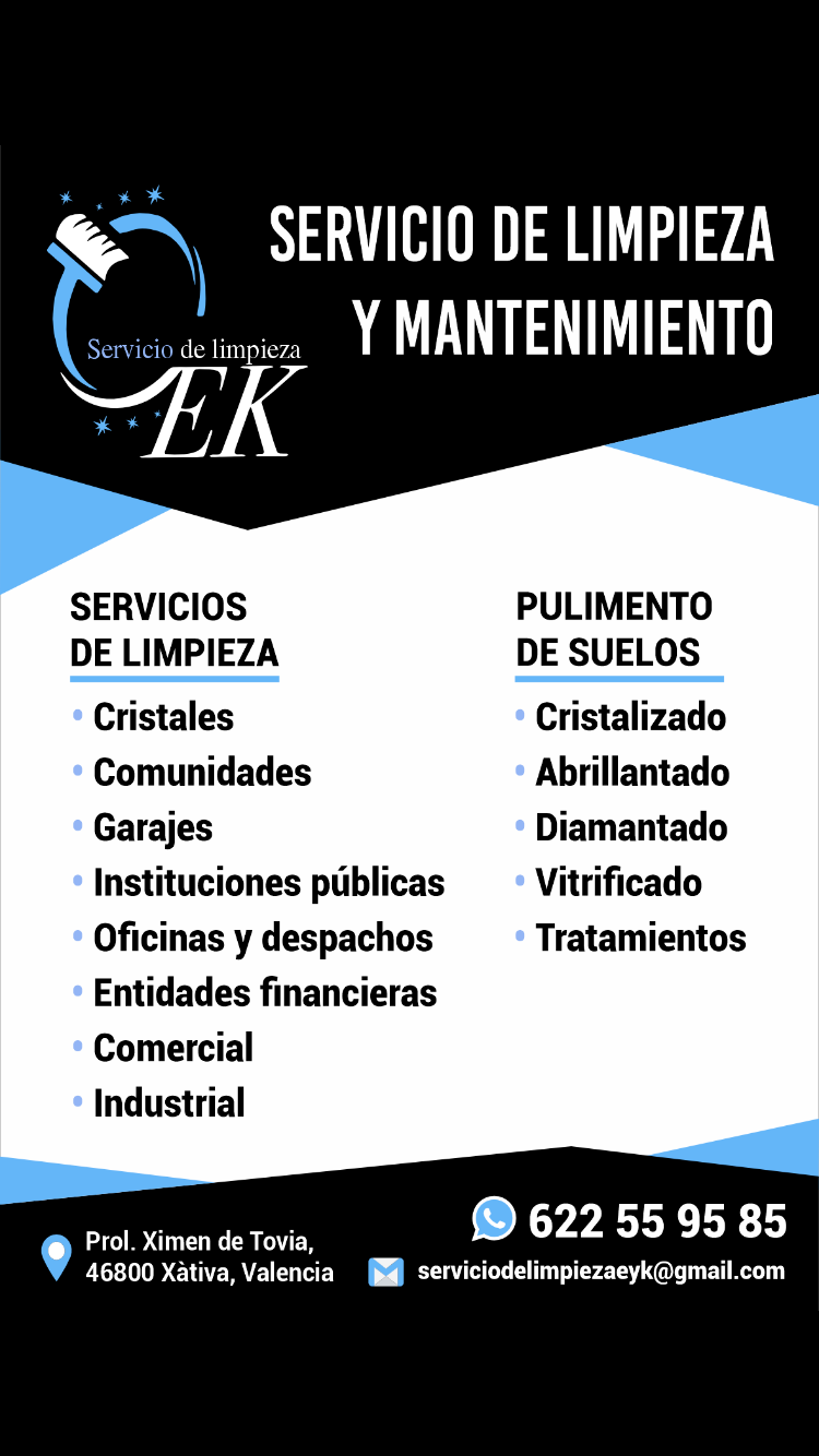 ¿Buscas una empresa de limpieza ? En servicio de limpieza EK somos expertos, realizamos limpiezas de comunidades ,oficinas , despachos……..en Xativa y alrededores (com valenciana) Nuestro equipo de profesionales se encargará que todo esté limpio , con materiales certificados, de primera calidad para poder obtener los mejores resultados. Contacta con nosotros y te atenderemos encantados, te resolveremos todas tus dudas y te ofreceremos un presupuesto sin compromiso. ¡Contacta con nosotros622559585